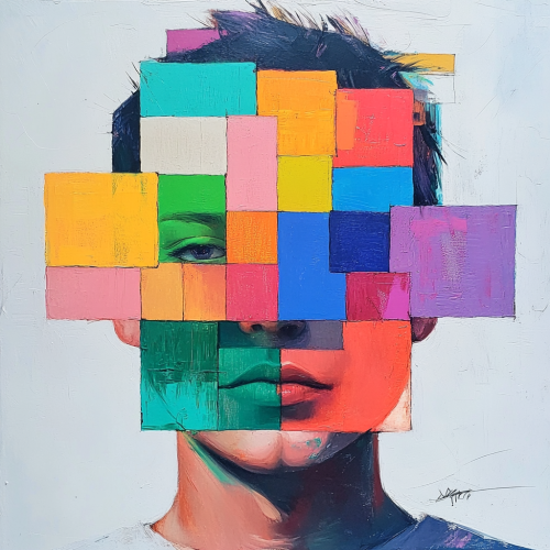 create a bunch of colourful squares thats hide a face, the ones to hide the identity of a person on a picture distorted on a white background, just the squares with no face on it