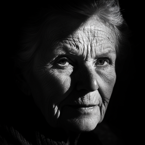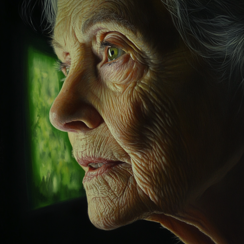 The portrait captures only the face of the elderly woman, rendered in close detail as she watches the flickering screen before her. Her deeply lined features are softly illuminated by the greenish glow of the monitor--Fern-Green--which bathes her face in a muted, ethereal light. Her eyes, faded hazel, are the focal point of the portrait. They reflect the screen’s green tint, giving them an almost ghostly quality, as if the light itself is pulling forth the memories she has stored within. The deep-set eyes are filled with quiet contemplation, the irises blending subtly with the green hue, creating a sense of connection between her inner thoughts and the images on the screen. The wrinkles and creases that mark her face are rendered with care, each line emphasized to tell the story of her life’s experiences. The artist captures the sag of her skin, the slight droop at the corners of her eyes and mouth, suggesting both the passage of time and the weight of the memories she carries. The green light smooths some of these lines, softening the harshness of age, but also adding a sense of depth and texture to her skin. Her silver hair, thin and pulled back, frames her face but is mostly kept in shadow, allowing the focus to remain on her expression. The light from the screen catches a few strands, giving them a faint shimmer that contrasts with the otherwise subdued palette of the portrait. Her lips, thin and slightly pursed, are barely touched by the green light, suggesting a silence that holds many unspoken words. There’s a slight tension in her jaw, barely perceptible, but it adds to the overall sense of introspection that the portrait conveys. The background remains dark and undefined, ensuring that nothing distracts from the woman’s face and the interaction with the [...]