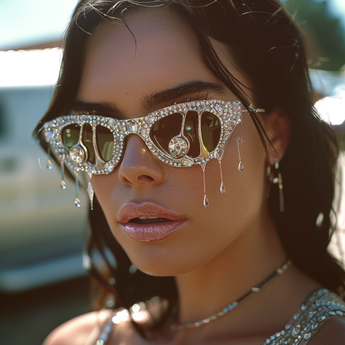 A beautiful woman in a surrealist setting. She is wearing beautiful rhinestone sunglasses. The outline of the left eye of the sunglasses is in the shape of a distorted dripping clock. Inspired by the clock found Salvador Dali the persistence of memory. The sunglasses are of the highest quality and resemble a bespoke luxury item. The shot is up close of her face. She is outside in the mid afternoon sun. In the style of 35mm film. sharp and Hyperrealistic :5 up close, centered, award-winning cinematography, award-winning photography, Canon EOS 5D Mark IV DSLR, f/8, ISO 100, 1/250 second, 18mm lens::3 blurry, dim, uninspired::-2 --s 750 --v 6.0