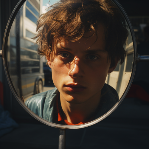 Portrait of a young man's distorted and exaggerated face, reflected in a convex street mirror