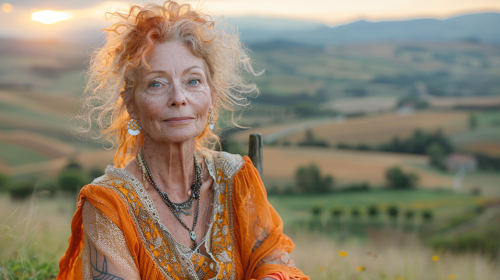 A portrait photography of a elderly ginger hair women in the style of Annie Leibovitz in a warm color palette in bright colors, full body, multiple poses and expressions, tatoo in half face, background panorama located in val d'orcia --ar 16:9 --style raw --stylize 750