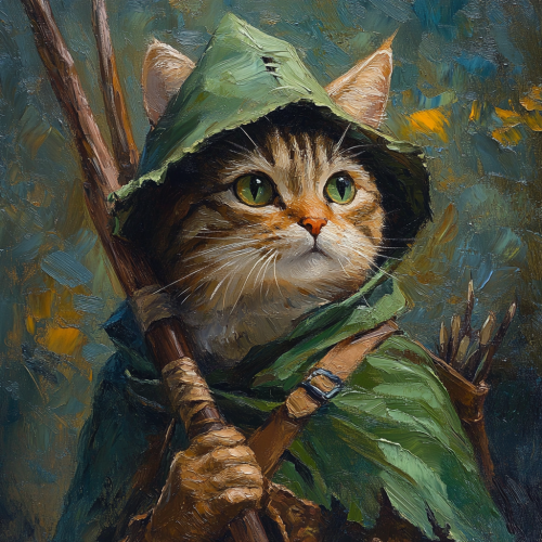 Foreground of a European Shorthair cat, dressed as robin hood. Hat on head and quiver on the back. Old oil painting style. Painting style. --style raw