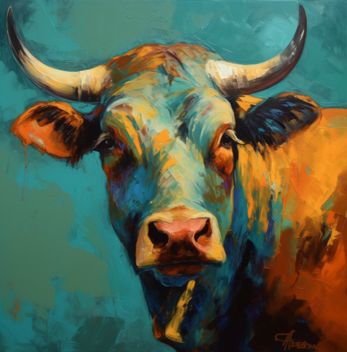 a painting of an oil bull in the style of Charles G. Sheeler, turquoise background, colorful palette, amber and brown, brushstrokes, textured canvas, thick impasto strokes, flat illustration, bold colors, playful character design, portrait, close up --ar 63:64 --v 5.0 --s 750