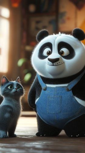 A cute panda, round and fat, with black and white fur, big dark circles under its eyes, wearing blue overalls, talking to a cat, Pixar style, 8K HD --ar 9:16