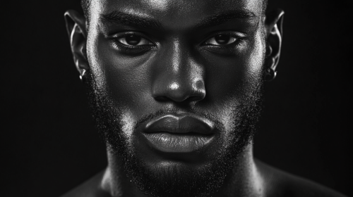 Perfect portrait editorial photoshoot in black and white of a Jamaican man, 25 years old, editorial, vogue portrait, studio professional, black background, perfect skin texture, hyper detailed, photo realistic --ar 16:9 --v 6.1