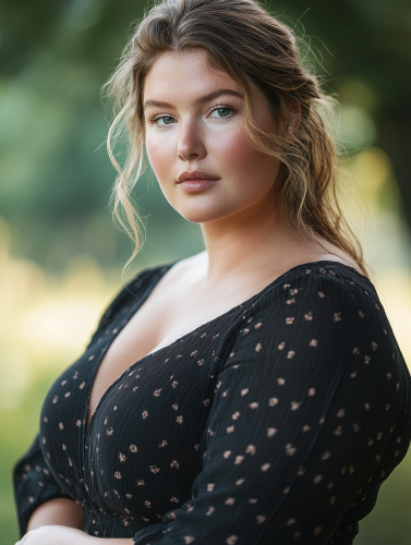 A medium shot of a 28-year-old woman with a chubby body, standing confidently, looking directly at the camera, in a natural outdoor setting with soft daylight, shot with a Nikon Z7 II, 50mm f/1.4 lens, natural colors --ar 3:4 --style raw