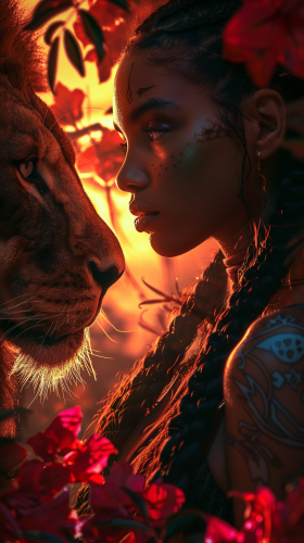 Beautiful woman with dark skin and long braided fabulous hair, powerful dangerous look, supervillain vibe, eerie, contrast lighting, fantasy, standing next to fantasy lion, flowers around, half body, 4k, Post-Production, VFX --v 6.0 --ar 9:16