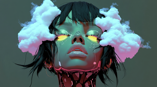 Surrealistic style, a woman's head is cut in half, with white clouds floating on the face and neck, obscuring her eyes and mouth, with simple shapes and lines, half-length portrait, iblack and green, the face is made up only of layered organic planes that appear to be floating above it, giving an illusionistic effect --ar 16:9 --sref 689229343::2 3154438697::1 2534928772::0.5 --sw 500 --stylize 1000