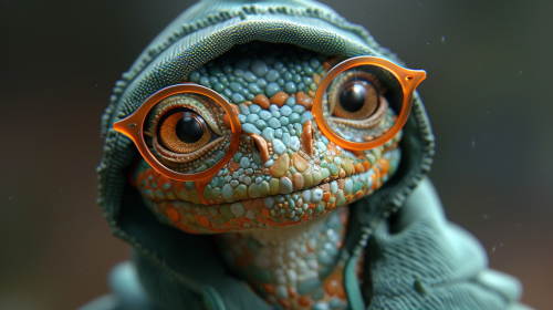 green Wyvern Dragon wearing a green hoodie with the hood down, wearing orange glasses with orange lenses, smiling broadly, quarter profile, light background, --ar 16:9 --s 750 --v 6.0