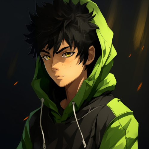 26 year old caucasian male, brown man bun, medium length beard, green eyes, light blue hoodie, anime style