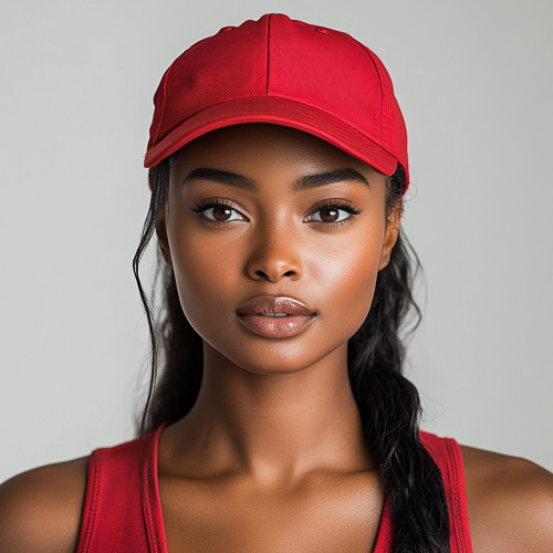 high res photoshoot portrait of a beatiful black woman wearing a red sports cap, the athletic beautiful woman who is desired by all, professional, athletic, scientific, emotional, romantic and strong is she, professional photoshoot on white background --s 250
