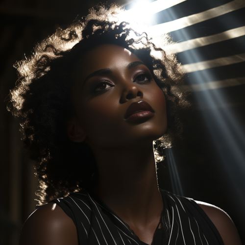 black woman portrait, dark, light rays on face, dramatic, strong, hard shadows, --s 500 --v 5.2
