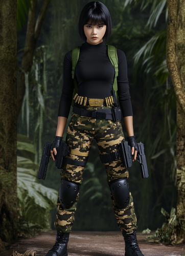 A realistic fullbody character of a beautiful brown skin thai woman with black short hair with bangs and long side burns, black long sleeve shirt, camo jogger pants with black knee pads, black military shoes, wearing a green backpack, a black and gold belt, black weapon holsters around thighs. She is standing off looking serious with a strong face holding her pistols down by her side in front of a jungle background --ar 8:11 --no makeup, ponytail, --style raw