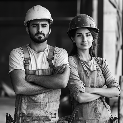 portrait photography of construction workers men and women , construction profesional clothes white background , HDR Light. Photorealistic image, professional photography. group photo.