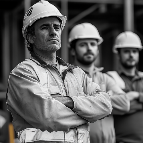 black and white photo of smiling man in hard hat, construction site, worker behind him, medium shot, 35mm lens, f/2.0 aperture, shutter speed value, ISO 480, studio lighting, soft light source, rule of thirds composition, highly detailed, hyper realistic, cinematic photography, --ar 128:85 --v 6.0