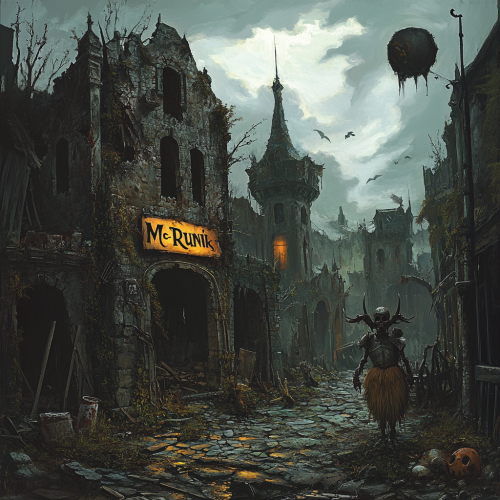 a painting of a ruin medevial village of a post apocalypse, a ruin manor thats been converted into a resturant, a suit of armor used a scarecrow holding a sign painted Mc Runi's on the entrance, grim dark, dark fantasy