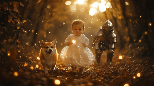 a chubby 1-year-old baby with big eyes wearing a white wedding dress, holding a glowing small flower, walking slowly in a mysterious, dimly lit forest. The focus is on the baby's cute face, with a corgi in knight's armor loyally following beside. The ground is covered with golden fallen leaves, and fireflies gently dance, creating a dreamy atmosphere. --ar 16:9