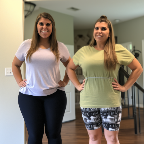 taken with iphone, overweight fat woman in gym shorts and crop tank top, full body, standing in her living room next to a skinny fit athetic woman with the same face, one woman is fat and the other is skinny, they have the same face --v 5.0