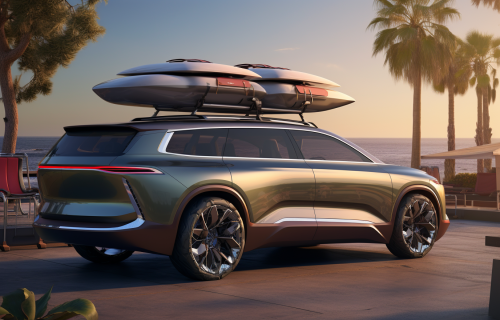 2023 buick roadmaster concept family station wagon, parked at theme park, luggage mounted to roof rack parking lot, 8k, --ar 14:9 --s 50