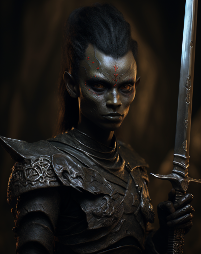 an realistic figure of an black elf in the dungeons and dragons style, wielding katana, in the style of dark palette, cartoon realism, caninecore, lifelike renderings, intertwining materials, sculpted --ar 89:112