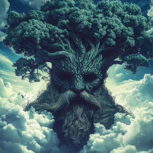 high contrast low saturation full color illustration of an ent that's a god. Sitting in the clouds above a mystical forest, the ent looks down at his dominion. The ent has a great bushy tree beard.