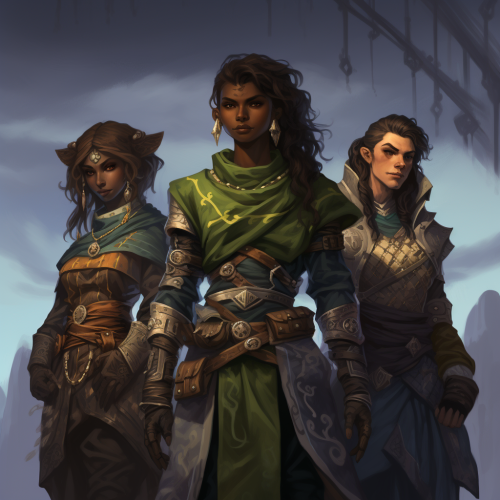 group of adventurers, dnd, 4 persons, first - male monk, young, bold and shaved; second - male warrior, curly hair, aristocratic; third - male elf, rogue, face hidden under hood; fourth - female orc girl
