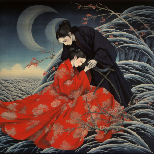 Japanese Art , the dream of the fisherman's wife style, the woman wearing kimono, the red otupus pretend as a human holding on her from back ,with long Slender, half-close eye.