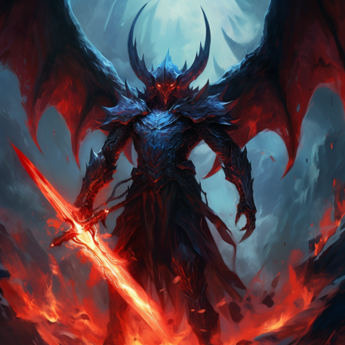 Create a powerful and imposing DnD 5e artwork of an archdevil with piercing blue magic eyes. He has a strong and jagged body and large demonic wings. There are blue flames all around him and coming from him. He carries a large demonic sword with large magical rubies in it. The sword is on fire with blue magic flames.