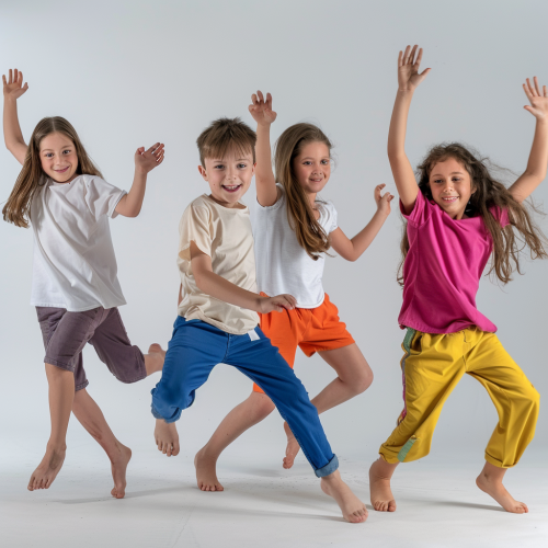 our happy children, aged 10 years old, photoshoot, doing dance poses, looking at the camera, hd quailty, light background, mixed nationalities