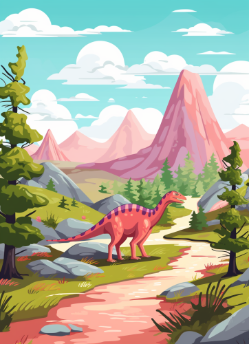 simple, cartoon style, dinosaures age landscape with vulcanos --ar 24:33