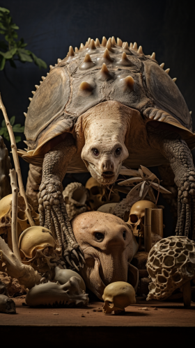glyptodon skeleton next to early human artifacts hyper realistic --ar 9:16