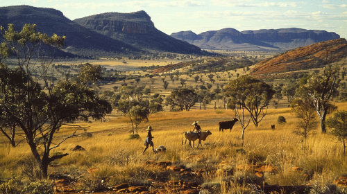 Rugged landscape scene in the Kimberley region of Northern Australia on September 24, 1972. The foreground shows Indigenous Australians tending to cattle and practicing traditional crafts, set against the backdrop of red rock formations and vast savannah. In the background, boab trees dot the landscape under a bright, clear sky. The lighting is warm and earthy, capturing the timeless and remote beauty of the Australian outback. --ar 16:9 --v 6.0 --style raw