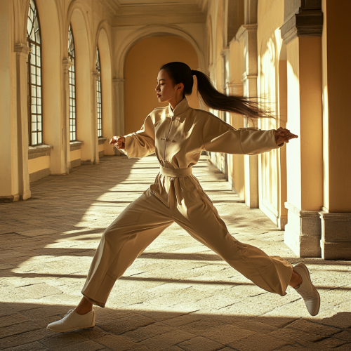 pretty female chinese inside the royal stables at Christiansborg wearing beige hermes leather jumpsuit vogue style and lunging forwards in a duel with an opponent. relaxing simple understated colours
