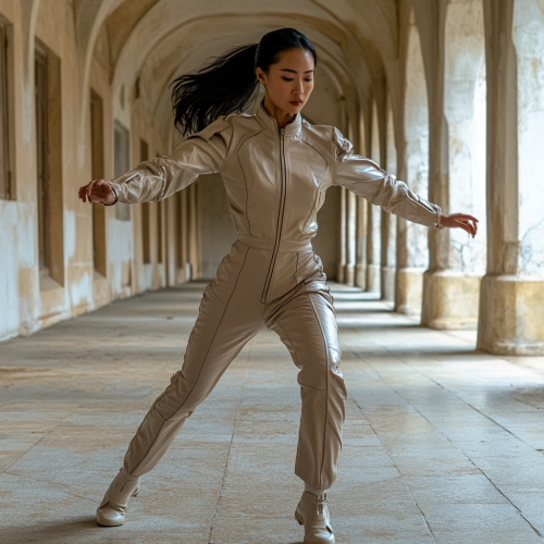 pretty female chinese inside the royal stables at Christiansborg wearing beige hermes leather jumpsuit vogue style and lunging forwards in a futuristic duel with an opponent. relaxing simple understated colours