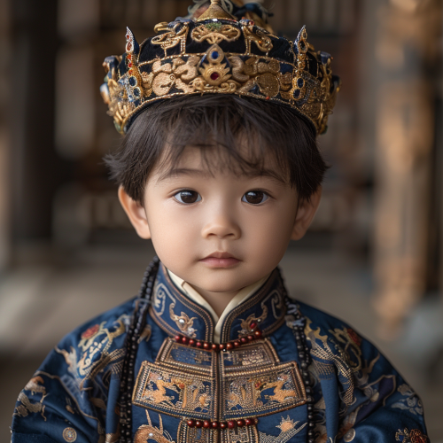 1-year-old Chinese child wearing royal clothes in the palace, dark tones, realistic style, short black straight hair --s 750