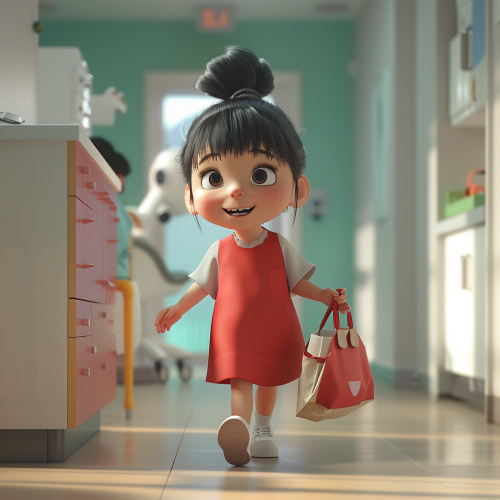 preschool chinese girl carrying a goodiebag out of dental office, pixar style
