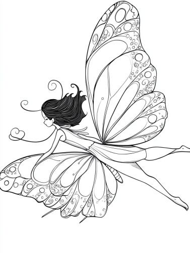coloring page for children, easy, white background. no clutter. black and white, no gray, a girl riding on the back of a giant butterfly. --ar 3:4 --style raw