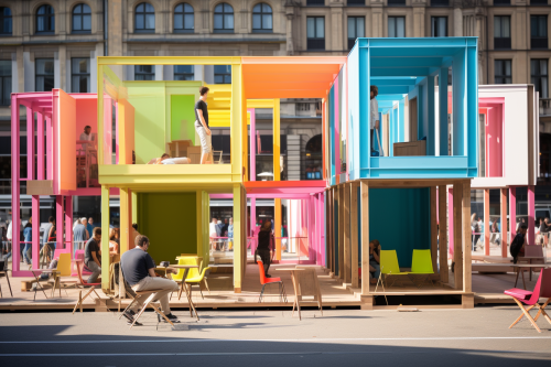 architectural pop up festival in front of the main train station of stuttgart. imagine architects and carpenters building street furtniture. add concerts in the background happy vibes and pride flags. view from slightly below eye niveau. people actually working on mock ups, models, furniture, workshops, --ar 3:2