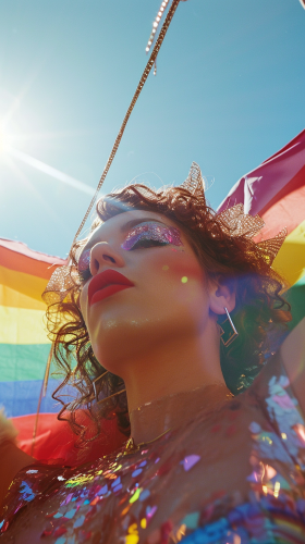 portrait of a drag queen at pride festival with glitter eyeshadow, cinematic lighting, 30mm lens, shot in 2023. candid, modern, sunshine, rainbow flags cinematic realism, shot with hasselblad 30mm, Kodak Ektar 100, --ar 9:16 --v 6.0 --style raw --s 50