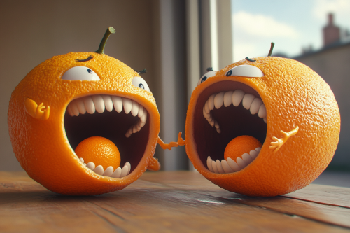 plain backgroun, an evil squeezer is aproaching towards two distracted happy oranges talking each other, they cannot perceive it, funny, for kids, hdr, highly detailed, style raw --chaos 10 --ar 3:2 --v 6.1