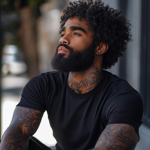 A athletic build BLACK MAN seated outside. He has DETAILED tattoos on his neck ONLY, wearing a black t-shirt. He has a beard and wild curly Afro. His edge up is sharp and perfect! Street guy, mafia vibe.