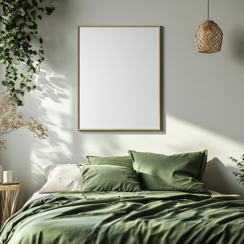 framed artwork, blank white A3 paper, vertical position, portrait orientation, hanging on wall of bedroom, close-up, small artwork size, bright studio space, mock up, front view, green bed sheets