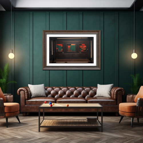 framed artwork, blank white A3 paper, vertical position, portrait orientation, hanging on wall of kitchen, bright studio space, mock up, front view, minialistic interior, bright space