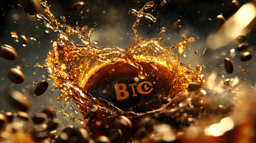 A dynamic splash of coffee from a tipped-over cup, with coffee beans in a BTC logo shape floating in mid-air around it, captured in a high-definition, hyper-realistic style, with intricate details and dramatic lighting that highlights the movement and energy of the scene --ar 16:9