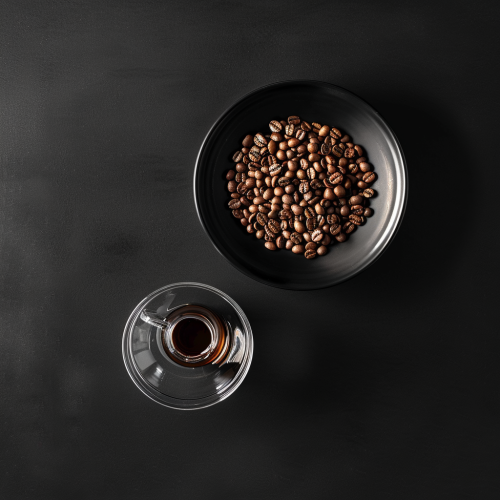 a professional mock up photography of somecoffee beans and coffee glass, neutral black textured background, top view, realism, realistic, focal length 150 mm --v 6.0