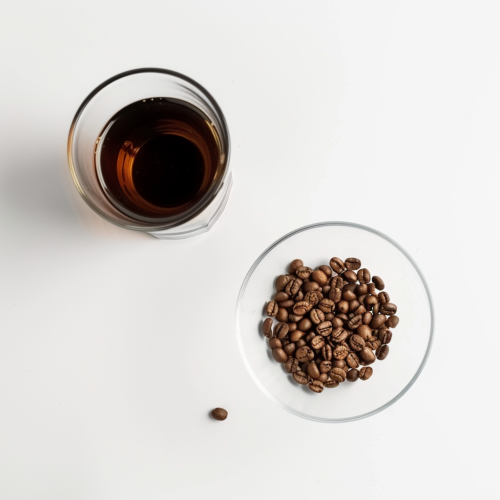 a professional photograph of somecoffee beans and glass of coffe, white background, top view, realism, realistic, focal length 150 mm --v 6.0