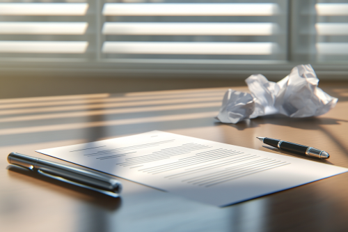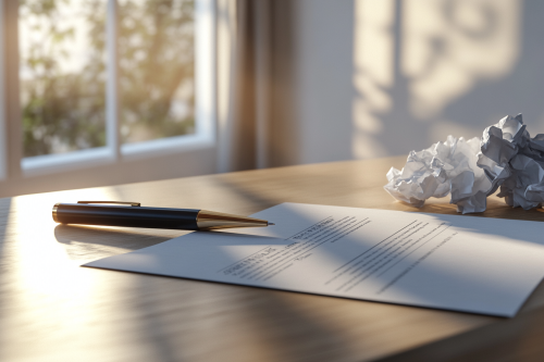 Visual concept of contract cancellation, featuring a pen placed beside a partially signed document on a modern office desk, crumpled papers nearby to suggest a change in decision, soft natural light highlighting the scene, simple and clean background. Photorealistic, highly detailed, 8K resolution --ar 3:2 --v 6.1 --style raw