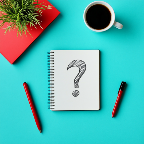 A creative flat-lay of a notebook, plant, and coffee cup on a desk with a question mark doodled on the notebook, suggesting brainstorming. Flat-lay image of a desk with a notebook, pen, coffee cup, and small plant. Red and blue accent colors. Keywords: minimalist, creative, brainstorming. Camera: Smartphone, Lens: Standard. Post: Bright, flat design with soft shadows.