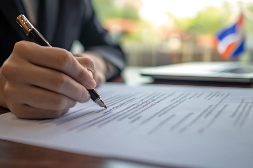 Design a close-up image of a hand signing a business contract in Thailand. The contract should have visible text in both English and Thai, with a signature line prominently displayed. The background can include a modern desk with a laptop and a small Thai flag, emphasizing the business environment in Thailand --ar 3:2 --v 6.1