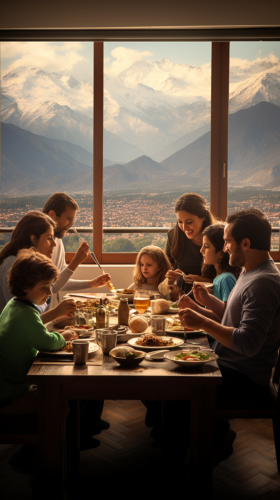 large Argentine family eating together at home, the background on the window is mountains, realistic, photography, --ar 9:16